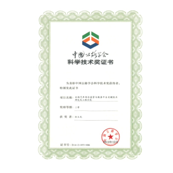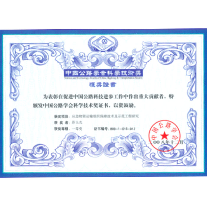 孙玉光总经理,在“应急物资运输组织保障技术及示范工程研究”项目中作出重大贡献,于2008年12月获得中国公路院学会科学技术奖“一等奖”。