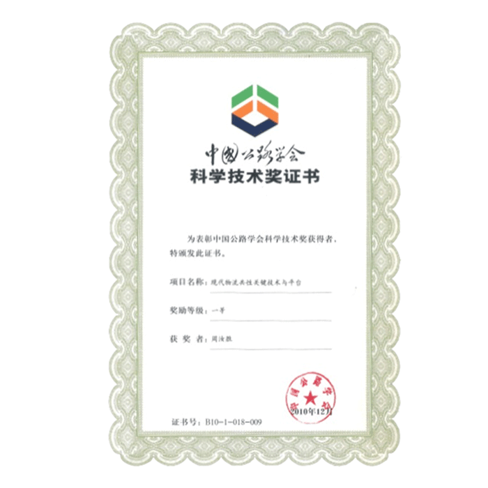 周汝胜博士,2010年12月在“现代物流关键技术与平台”项目中,获得中国公路院学会科学技术奖项“一等奖”。