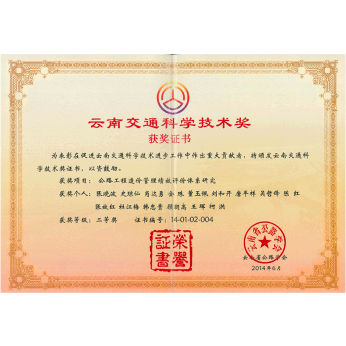 王珲博士,2014年6月在“公路工程造价管理绩效评价体系研究”项目中,获得云南交科学技术奖项“三等奖”。