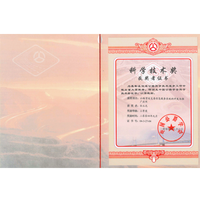 总经理孙玉光,2004年9月在“公路货运交易信息服务系统的开发与推广应用”项目中,获得中国公路院学会科学技术奖项“三等奖”。